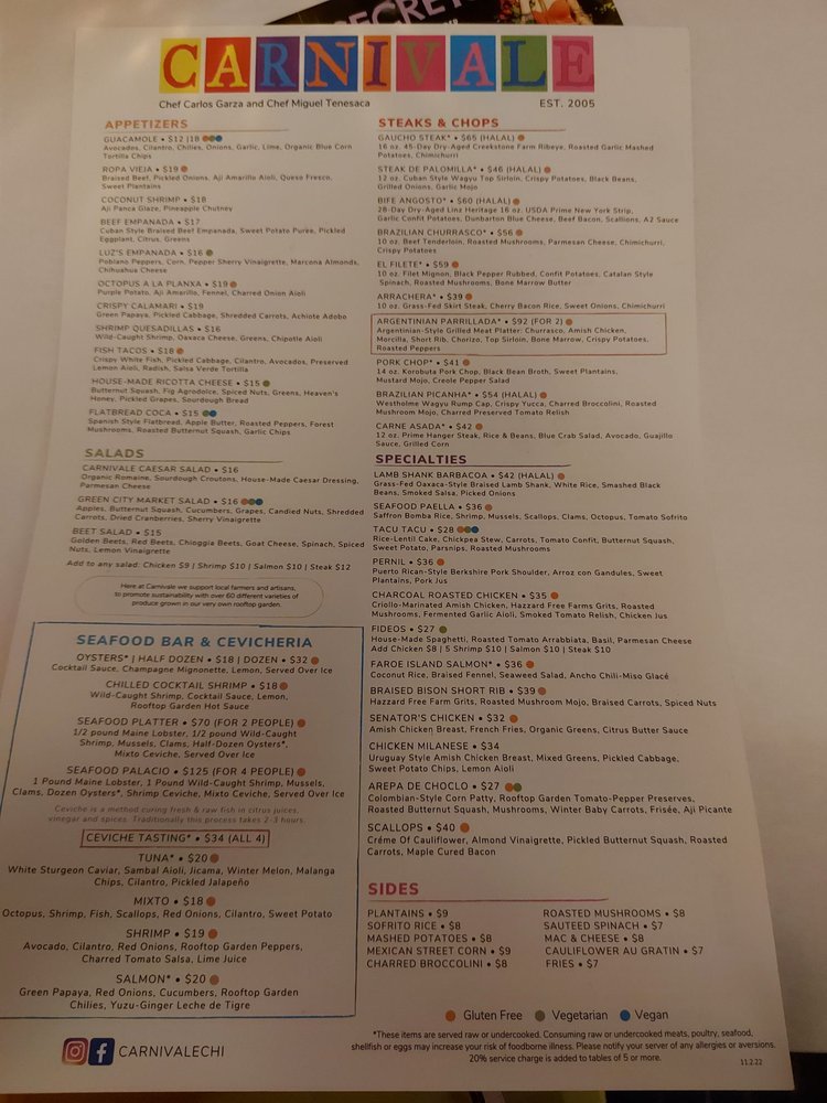 Carnivale, a vibrant New American-Latin American restaurant located in Chicago's West Loop, offers a festive and colorful dining experience. With a wide range of amenities including a full bar, heated outdoor seating, and live entertainment, Carnivale promises a lively atmosphere perfect for groups and families.